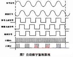 由于測量信號頻率較高,直接對其進行鑒相難以達到良好的鑒相精度,因而在系統中采用混頻的方法進行差頻鑒相。在差頻鑒相中,參考信號和測量信號同時與本振信號進行混頻,濾除混頻后高頻分量,得到混頻后低頻參考信號和混頻后低頻測量信號?;祛l降低了信號頻率,但保持相位差不變,便于鑒相操作。相位差的檢測使用自動數字鑒相法。其原理如圖7所示。參考信號和測量信號通過過零比較,得到參考方波信號和測量方波信號。比較兩方波信號,得到兩者之間的相位差信號,然后使用高頻計數脈沖對相位差信號,然后使用高頻計數脈沖對相位差信號進行計數。設參考信號和測量信號的周期為f,高頻計數脈沖的頻率為fc,一個周期內的計數值為M,則相位差為:△φ=2πMf /fc。為了減小偶然誤差,提高鑒相精度,可以對多個周期計數求平均。設N個周期的計數值為M'',則△φ=2πM''f/Nfc。