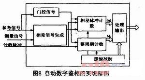混頻電路的實現基于混頻器AD831。使用兩片AD831,分別用于參考信號與本振信號混頻及測量信號與本振信號混頻?;祛l后使用芯片MAX274進行帶通濾波,得到混頻后的低頻正弦信號。然后通過基于MAX912的過零比較電路將正弦信號轉換為同相位差的方波信號,輸入到FPGA中進行鑒相。在FPGA中,利用多周期自動數字鑒相法,對相位差進行檢測。其實現框圖如圖8所示。