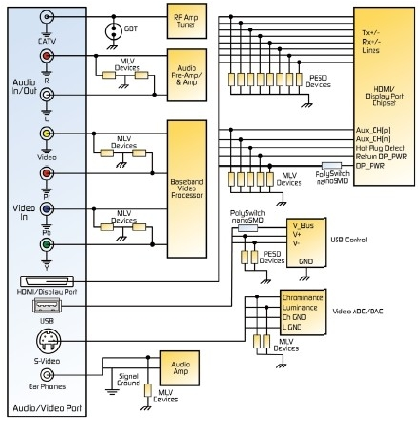 圖4. 典型的運用MLV元件, PESD抑制元件以及PolySwitch過電流保護元件的顯示端口電路保護設計