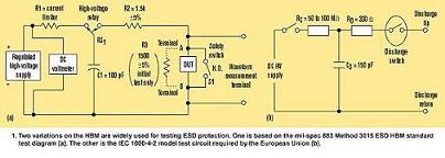 最流行的HBM變種是國際電工委員會IEC1000-4-2標準,定義為150pF電容通過一個330Ω電阻放電(圖1b)。這是歐盟對在其區域內商品銷售所必須的國際測試。