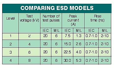 但是,明顯的瞬間電壓威脅和能量等級的不同存在于兩個模型之中。于是設計工程師可以使測試過程適合他們所期望的具體應用。例如,IEC1000-4-2具有一個非常快速的電平脈沖上升時間,能應用更多的脈沖和更高的峰值電流(見表格)。
