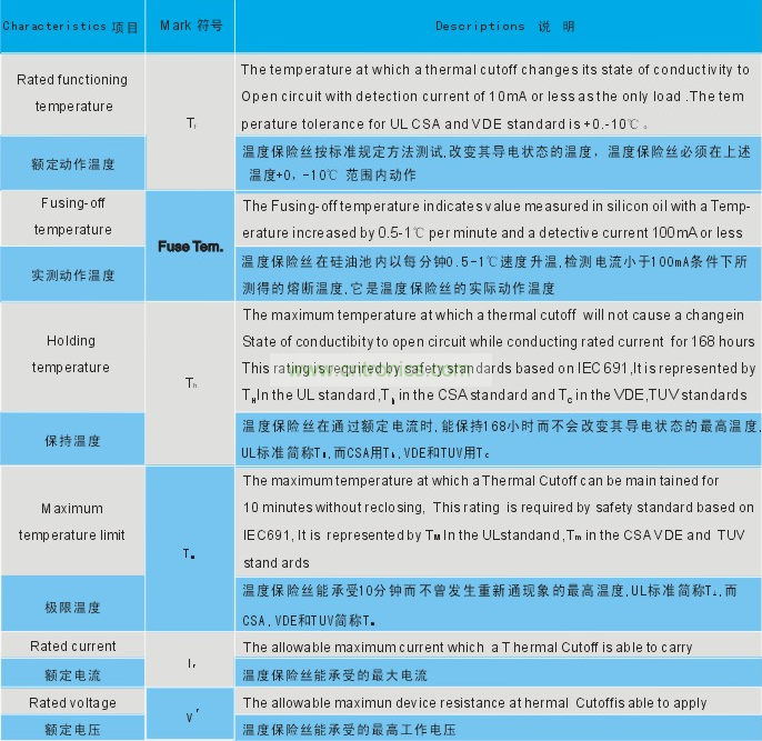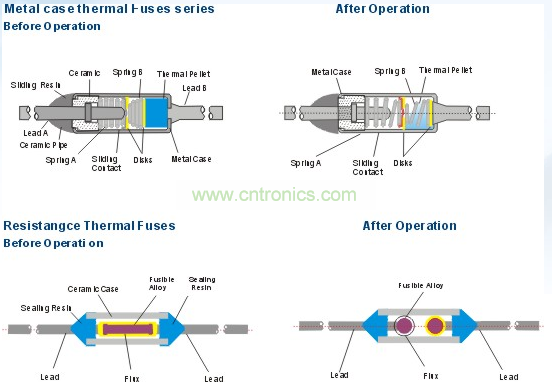 當(dāng)溫度保險(xiǎn)絲周圍溫度上升到它的動作溫度時,其易熔合金熔化并在表面張力作用下及特殊樹脂幫助作用下,收縮成球狀附兩引腳未端或保險(xiǎn)絲內(nèi)彈簧的彈力推走電極作用,這樣電路被切斷