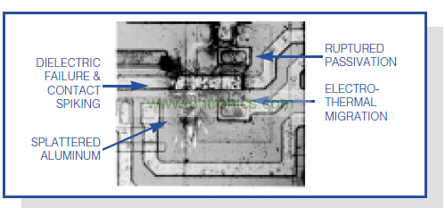 圖1.該顯微圖片表示不帶保護(hù)的 RS-232接收器受ESD沖擊后造成的損壞情況