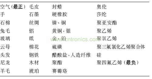 表1列出了不同材料摩擦起電的電荷特性,如玻璃、尼龍帶t1:電,硅、聚四氟乙烯帶負(fù)電。材料的導(dǎo)電性也對材料表面建立電荷的能力有影響,許多材料的導(dǎo)電性或表面電阻很大程度上取決于濕度,濕度越低導(dǎo)電能力越低,越容易阻止電荷的遷移使其停