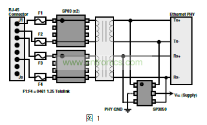 任何線路端保護裝置(這個例子中的 SP03A)不能有 GND引腳(2、3、6 和 7)連接到 GND,以保證符合 IEEE802.3隔離標準;因此,設計師沒有選擇,只能將此設備作為“異模”保護器。(注:當然,這使得驅動端保護元件成為必要,以保護系統免受共模事件損壞。)