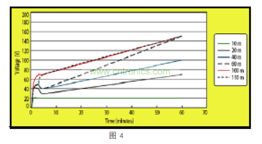 隨之而來的高能量放電可能會損壞連接器,變壓器電路,或以太網收發器。雙絞線電纜表現像一個存儲電荷的電容器。有研究證明,未連接到終端的雙絞線電纜可能會積累幾百伏的電荷。此外,在一個小時內,完全放電的電纜可以積累其所能積累總電荷的一半。一旦有了靜電,高品質的電纜保留其所帶靜電的時間可以超過 24 小時。下面圖 4展示了不同長度的 CAT5 電纜積累靜電如何隨著時間而變化。由于較長的電纜有容量來存儲更多的電荷,電纜長度超過 60m 的系統應采取額外的 CDE 預防措施。