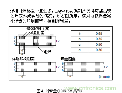 例如,LQW15A系列為獲得最適當(dāng)?shù)暮稿a量,本公司提供了焊錫厚度和焊盤尺寸對(duì)應(yīng)的推薦焊錫量。(圖4)
