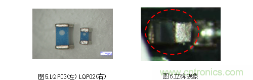 例如,元件單側(cè)未與焊錫接觸而引發(fā)豎起的立碑現(xiàn)象(曼哈頓現(xiàn)象),也稱為封裝不良情況。(圖6)