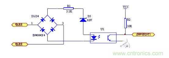 當沒有振鈴信號時,線路上的供電電壓為48V(部分交換機為60V),經(jīng)四個二極管構(gòu)成的全橋整流后,不足以使62V穩(wěn)壓管導通,振鈴信號輸出端電壓接近0V,當振鈴信號到來時,線路上的90V交流振鈴信號經(jīng)全橋整流變換后90V的脈動直流電,其峰值足以擊穿耐壓值為62V穩(wěn)壓管,經(jīng)電阻R1給U1提供電壓,從光電耦合器輸出的波形是 時通時斷的方波方波信號,可以直接輸出至單片機的中斷輸入口, CPU可以根據(jù)振鈴信號光電轉(zhuǎn)換后的高低電平檢測有無振鈴。