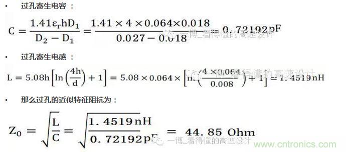 此公式是將過孔等效為傳輸線的模型來計算的,如果常規我們單端信號是50歐姆的特征阻抗,過孔的阻抗如上計算約為45歐姆,拉低了整體的特征阻抗,所以說呈現容性效應。