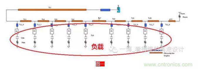 容性負載?是負載呈容性,還是帶容性的負載?呵呵,這不一個意思嘛,中國的語言,難怪老外覺得很難搞懂,自己人都被繞暈了。負載怎么會呈容性呢?這個主要是在多負載的情況下,如下圖一所示,由于分支和負載較多,不可避免的會增加過孔來連通信號,普通過孔是呈容性的,其次還有芯片封裝上的寄生電容(約0.33~0.44pF),另外還有Die上的寄生電容(約0.77~2.12pF),所有的這些電容會降低信號線的有效特征阻抗。