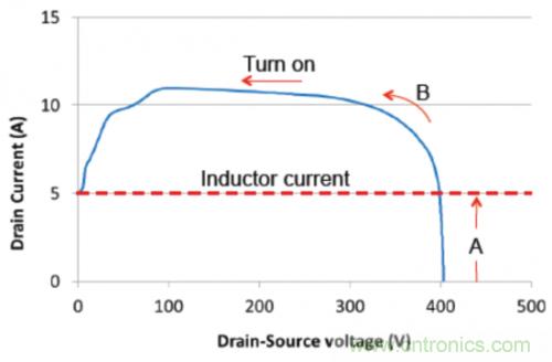 圖3:針對(duì)一個(gè)硬開關(guān)變換的接通轉(zhuǎn)換。