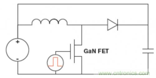 當(dāng)GaN FET關(guān)閉時(shí),電感器電流通過一個(gè)二極管再次流至輸入端,這就免除了對(duì)負(fù)載電阻器的需要,并且能夠達(dá)到節(jié)能的目的。這個(gè)單元與處于連續(xù)電流模式下的電感器一同運(yùn)行。由于目標(biāo)是開關(guān)變換,通過使用短占空比,可以達(dá)到節(jié)能的目的。這個(gè)元件能夠改變施加的電壓、電流、頻率,以及器件所處環(huán)境的溫度。額外的漏電流(圖4)由二極管電容提供。