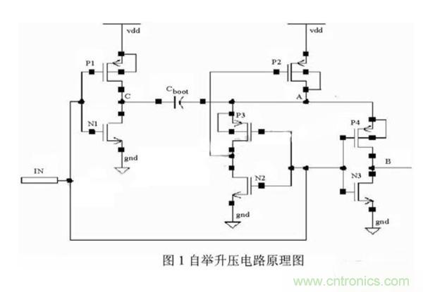 自舉升壓電路的原理圖如圖1所示。所謂的自舉升壓原理就是,在輸入端IN輸入一個方波信號,利用電容Cboot將A點(diǎn)電壓抬升至高于VDD的電平,這樣就可以在B端輸出一個與輸入信號反相,且高電平高于VDD的方波信號。具體工作原理如下: