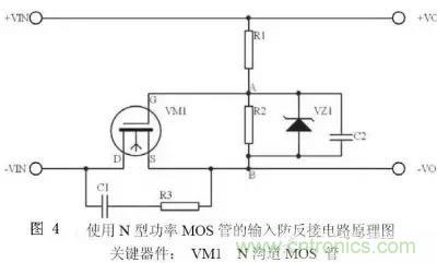 圖3利用了MOS管的開關特性,控制電路的導通和斷開來設計防反接保護電路,由于功率MOS管的內阻很小,現在 MOSFET Rds(on)已經能夠做到毫歐級,解決了現有采用二極管電源防反接方案存在的壓降和功耗過大的問題。