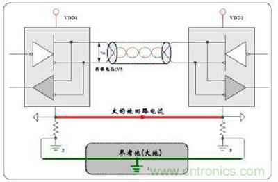 干擾不但影響信號(hào),更嚴(yán)重的會(huì)導(dǎo)致板子死機(jī)或者燒毀,所以接口和電源的隔離是抗干擾的第一條“軍規(guī)”.隔離的主要目的是:避免地回流燒毀電路板和限制干擾的幅度,保護(hù)控制器不死機(jī)。如圖3所示,為未隔離時(shí),兩個(gè)節(jié)點(diǎn)的地電位不一致,導(dǎo)致有回流電流,產(chǎn)生共模信號(hào),CAN的抗共模干擾能力是-12~7V,超過(guò)這個(gè)差值則出現(xiàn)錯(cuò)誤,如果共模差超過(guò)±36V,燒毀收發(fā)器或者電路板。