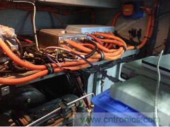 遠(yuǎn)離干擾源是最簡(jiǎn)單的抗干擾方法,如果CAN線與強(qiáng)電干擾源遠(yuǎn)離0.5米,干擾就基本影響不到了。可是在實(shí)際布線中,經(jīng)常遇到空間太小而不得不和強(qiáng)電混在一起,如圖12所示,為某新能源汽車(chē)的驅(qū)動(dòng)系統(tǒng),CAN線與驅(qū)動(dòng)線混在一起,結(jié)果導(dǎo)致干擾很大。只要與CAN并行的驅(qū)動(dòng)線,具備2A/秒的電流變化,就會(huì)耦合出強(qiáng)磁場(chǎng)而導(dǎo)致CAN線上出現(xiàn)干擾脈沖。所以CAN線必須要和電流會(huì)劇烈變化的線纜遠(yuǎn)離。比如繼電器、電磁閥、逆變器、電機(jī)驅(qū)動(dòng)線等。