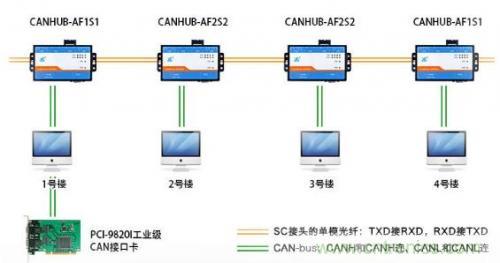 抗干擾的終極手段就是把CAN轉(zhuǎn)化為光纖傳輸,光纖是一種無(wú)法被電磁干擾的傳輸介質(zhì)。如果前5種抗干擾手段均無(wú)法解決干擾問(wèn)題,可以把CAN轉(zhuǎn)化為光纖,實(shí)現(xiàn)“無(wú)懈可擊”。如圖15所示。為使用致遠(yuǎn)電子的CANHub-AF1S1和CANHub-AF2S2組合的光纖主干網(wǎng)絡(luò)。