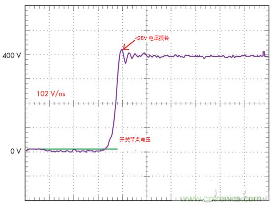 2.如通過優化的驅動器設計的GaN開關波形所證明的,GaN可以非常高速的轉換速率工作,并且使交換節點上的振鈴最小。