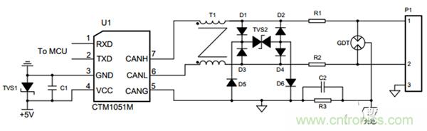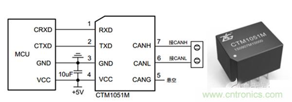 圖2.隔離型CAN收發模塊及應用電路