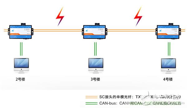 有沒有方法能徹底解決雷擊造成的隱患呢?答案是肯定的,只要數據的傳輸不依賴電信號就能完全隔離掉雷擊的危害。我們可以把CAN總線室外的部分或者說容易受到干擾的部分使用光信號傳輸,這種方法目前已經廣泛應用于高速鐵路、地鐵、煤礦、醫療、航空航天、樓宇安防、電梯控制等場合。