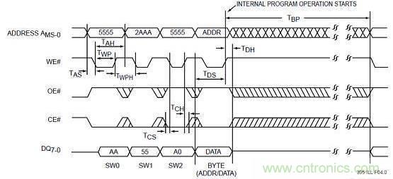 從圖中我們可以看出ADDRESS是表示地址總線的,DQ是表示數據總線的,CE是片選信號,且是低電平有效,其寬度要保證在進行讀操作時總是有效的。學會看時序圖對于做嵌入式系統開發非常有幫助,因為我們不可避免的要與芯片打交道。在時序圖中,通常會標識很多的時間需求信息。在寫啟動代碼時需要初始化各地址空間的片選地址寄存器和讀寫時序,時序的配置依據就是來自于外設芯片的時間需求,這是芯片手冊很重要的一部分內容。當一個地址空間中存在多個外設芯片時,我們需要考慮到其中最慢的外設芯片的時間需求,否則的話有的芯片就不能正常工作。