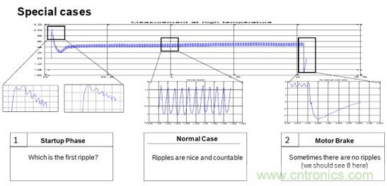 由于電機(jī)在啟動(dòng),停止,反轉(zhuǎn),堵轉(zhuǎn)時(shí)的紋波特征不明顯。如圖5和圖6,不能精準(zhǔn)的計(jì)數(shù)紋波個(gè)數(shù)。只能通過(guò)算法進(jìn)行補(bǔ)償。這樣紋波計(jì)數(shù)必然和實(shí)際的必然存在誤差。而這誤差隨著車(chē)窗操作次數(shù)的增加,誤差也會(huì)跟著累積。