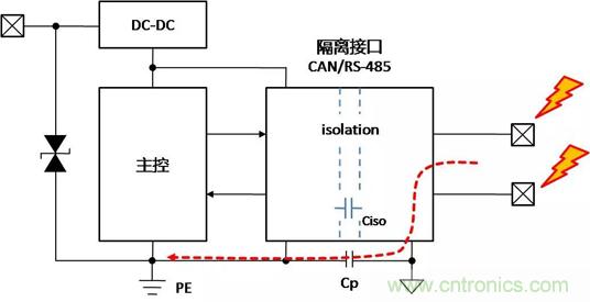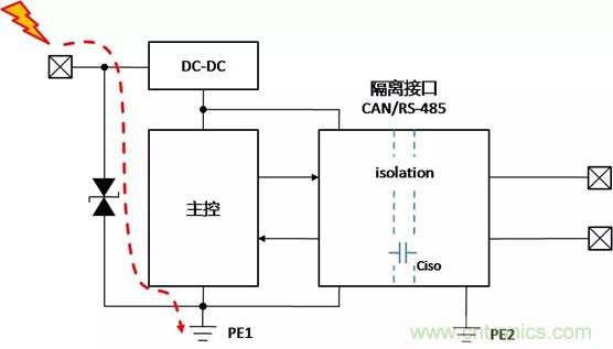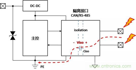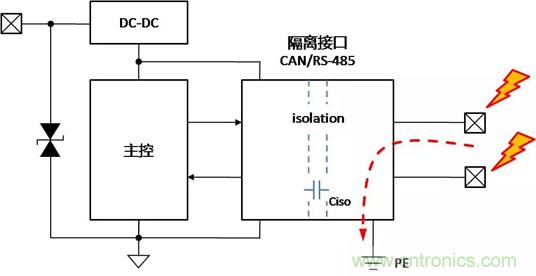 帶隔離通信接口的設備,在不同的使用、安裝狀態下,接口會表現出完全不同的ESD特性,了解設備在不同的使用狀態下,ESD對接口的影響的機理,才能有針對性地增加保護器件,提升隔離接口的ESD能力。下面以帶有隔離CAN或RS-485通信接口為例,對常見的設備狀態下,ESD的作用機理進行分析,并提出相應的改善措施。