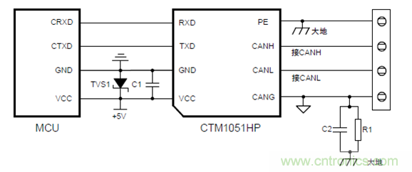 由于設備實際應用中會存在各種不同的狀態,對于與上述描述不同的情況,也可按以上的方法進行分析,并有針對性的增加保護器件,從而達到提升ESD抗擾能力的作用。廣州致遠電子有限公司基于多年的總線防護設計積累推出了高防護等級隔離模塊——CTM1051(A)HP系列。該系列符合國際ISO11898-2標準,靜電防護等級可達接觸±8kV,空氣放電±15kV,浪涌防護可達±4kV隔離CAN解決方案,具體如下圖15所示,能夠適用于各種惡劣的工業現場環境。應用簡便,即插即用,應用原理圖如下圖16所示。