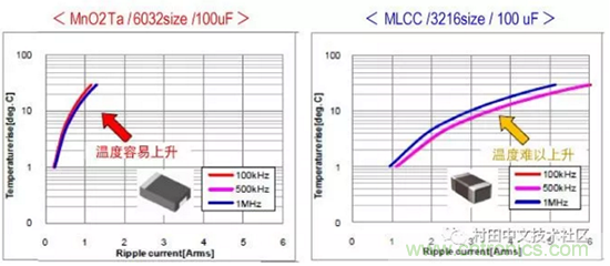 由上圖可知,大于100kHz頻率時,與Ta電容器(MnO2) 100uF相比,盡管MLCC 22uF的靜電容量小,但其阻抗更小。這是因為MLCC的ESR、ESL更小。