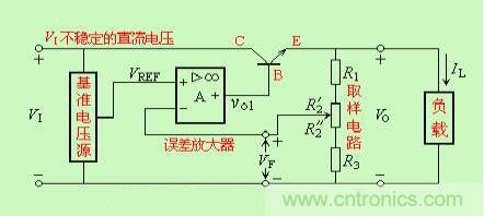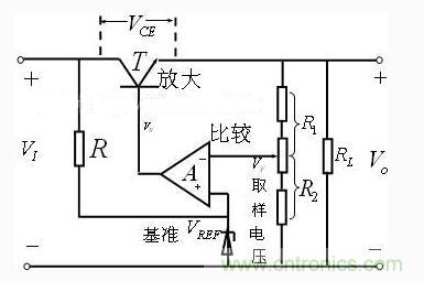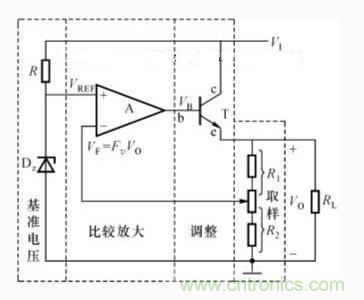 VI是整流濾波后的電壓,T為調整管,A為比較放大電路,VREF為基準電壓,它由穩(wěn)壓管Dz與限流電阻R構成。R1與R2組成反饋網(wǎng)絡,是用來反映輸出電壓變化的取樣環(huán)節(jié)。