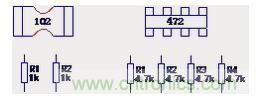 b、用4位數(shù)字表示電阻值。前3位為有效值,即千位、百位和個位值,第4位為0的個數(shù)。如標注為1501,即為1500Ω;標注為1000,即為100Ω;標注為681,即為680 Ω;標注為1003,即為100kΩ。1Ω以下的值加R表示,同上。