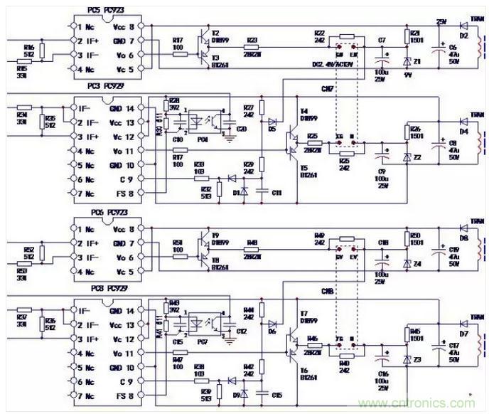 如圖2-9所示,PC5與PC6兩路驅(qū)動IC的外圍電路的元件參數(shù)完全相同;PC3與PC8兩路驅(qū)動IC的外圍元件參數(shù)完全相同,R17=R51、R23=R48、R22=R49……,當(dāng)PC3外圍有元件損壞壞,可以“照搬”PC5相對應(yīng)外圍元件的參數(shù)值進行修復(fù)。