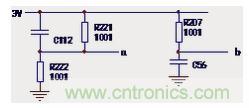 如下圖6所示電路中,測量a點電壓正常值應(yīng)為R221、R22對3V供電的分壓值1.5V,若測量電壓值高于1.5V,可能系電容C112漏電損壞所致;測b點電壓正常值應(yīng)為3V,若低于3V,可能系電容C56漏電損壞所致。