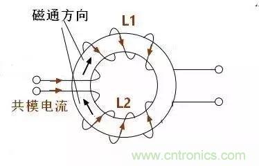 假設一對共模電流流向如下圖所示,兩個濾波電感各自獨立,沒有磁通上的聯(lián)系,這樣能不能濾波共模電流呢?當然也能,相當于差模電感,各自為戰(zhàn),效果差一點。