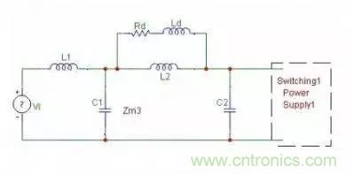 這是用的最多的一種,如圖,通常都僅僅在電感上并聯(lián)一個阻尼電阻,這個阻尼電阻不可少,曾經看到有些貼問這個電阻干什么用,有各種說法,但很少有說對的,請記住這個是阻尼電阻,為了消除干擾信號在濾波器的截止頻率處產生尖峰,達到243樓的的幅頻特性的加阻尼后的效果。有人說前面一個C1電容可以省去,這個說法不對的,我們前面已講過,每加一個儲能元件 L 或 C,濾波器的階數(shù)并升高一階,對信號的衰減可以增加20dB/十倍頻程,pi 濾波器是三級濾波器,把C1拿掉后變成了二階,濾波效果會打折扣。