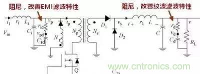 這是一個正激電源,請?zhí)貏e注意,輸入LC的EMI濾波器和輸出的紋波濾波器都有一個電容串聯(lián)電阻的阻尼電路,阻尼作用前面已多次提及。特別注意輸出端的阻尼電路,曾經見過帖子問為何在電解電容上串聯(lián)一個電阻,但似乎都沒有人知道為什么,請記住這是為了改善紋波性能加上的阻尼電路,有了這個阻尼電路課大大改善紋波性能。道理同EMI濾波器的阻尼相同。