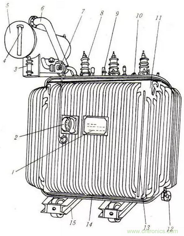 1-銘牌;2-信號式溫度計;3-吸濕器;4-油標(biāo);5-儲油柜;6-安全氣道;7-氣體繼電器;8-高壓套管;9-低壓套管;10-分接開關(guān);11-油箱;12-放油閥門;13-器身;14-接地板;15-小車;16壓力釋放閥(補充:圖左上側(cè))
