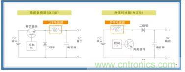 由于電源電路的功率電感器中會(huì)流過大電流,因此繞組型為主流產(chǎn)品。這是因?yàn)椋ㄟ^將高導(dǎo)磁率的磁性體(鐵氧體或軟磁性金屬)用于磁芯中,以較少巻數(shù)實(shí)現(xiàn)高電感值,從而可使產(chǎn)品更為小型化。圖3所示為使用功率電感器的DC-DC轉(zhuǎn)換器(非絕緣型及斬波方式)基本電路。