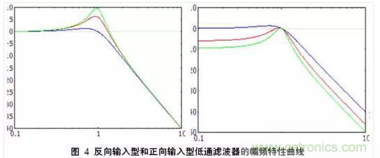 正向輸入型和反向輸入型最大的區(qū)別在于通頻帶的增益。下面給出低通濾波器時(shí)的幅頻特性曲線。兩邊的曲線一對(duì)比他們的區(qū)別就一目了然了。