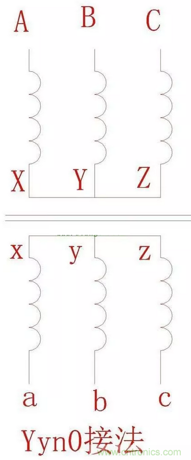 2.Yyn0的意義:Y:高壓側(cè)星型接法,無中性點引出;y:低壓側(cè)星型接法;n:中性點引出;0:高低壓差位差0度。