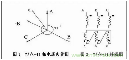 如圖1所示,Y/△-11的聯(lián)接組別,順時針旋轉(zhuǎn)了330°后再畫出次邊a相的相電壓矢量,此a相相電壓矢量在原邊A相與B相反方向-B的合成矢量上,由于原次邊三相繞組A、B、C和a、b、c相對應,我們把次邊a相繞組的頭連接次邊b相繞組尾,作為次邊a相的輸出線,由此在三角形接法中,只要確定了次邊a相的連結(jié),其他兩相的頭尾連接順序和引出線就不會弄錯。因此根據(jù)原次邊相電壓矢量便可畫出Y/△-11組接線圖,如圖2所示。