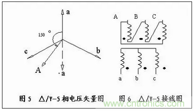 如圖5所示,先畫出△/Y-5組的矢量圖,再逆時針旋轉(zhuǎn)150°,畫出原邊A相相電壓矢量,此A相相電壓矢量上,因此根據(jù)此矢量圖便可畫出△/Y-5組的接線圖可知,次邊a、b、c三個頭作為a、b、c三相的輸出端,原邊A的尾C的頭,B的尾接A的頭,C的尾接B的頭分別作為A、B、C三相的輸出端,見圖6。