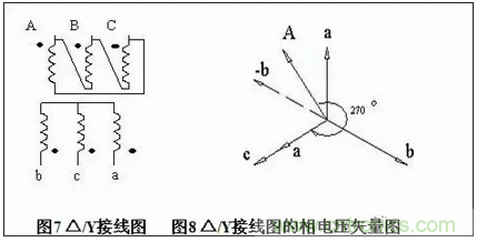 如圖7所示,識別圖中△/Y的接線圖它屬于幾組,根據(jù)上面的方法,畫出次邊a、b、c三相相電壓矢量圖,從接線圖中可以看出原邊A相繞組的頭連接B相繞組的尾作為原邊A相引出線,因此我們把原邊相電壓矢量A畫到次邊矢量a和-b中間,而次邊C相繞組的頭作為次邊a相輸出,因此我們把次邊矢量C當成是矢量a調(diào)相來使用,然后以原邊A相順時旋轉(zhuǎn)到次邊a相,它們的夾角為270°,因此這個接線圖為 △/Y-9聯(lián)接組,見圖8。