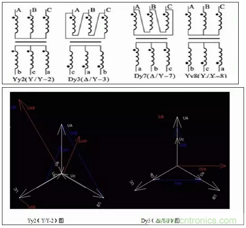 常見變壓器高壓側(cè)有三角形和星型接法,低壓側(cè)也有三角形或星型接法;這幾種接法相組合,加上高壓側(cè)和低壓側(cè)電壓形成一定的角度差;再加上高低壓側(cè)中性點有接地和不接地兩種方式,這就構(gòu)成了變壓器連接組別的所有要素。