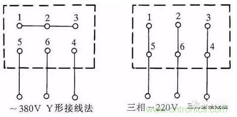 有部分三相吹風(fēng)機有6個接線端子,接線方法如圖2所示。采用△形接法應(yīng)接入220V三相交流電源,采用Y形接法應(yīng)接入380V三相交流電源。一般3英寸、3.5英寸、4英寸、4.5英寸的型號按此法接。其他吹風(fēng)機應(yīng)按其銘牌上所標(biāo)的接法連接。