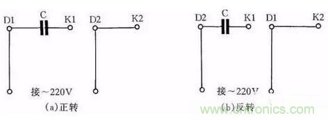 圖16(a)為可逆控制線路,操縱開關(guān)S2,可改變電動機的轉(zhuǎn)向,該線路一般用于家用洗衣機上。