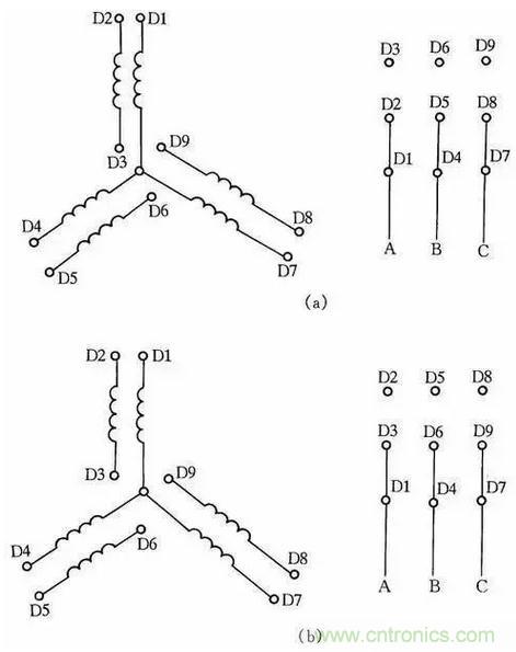 按圖8(a)連接是一種轉(zhuǎn)速,按圖8(b)連接得到另一種轉(zhuǎn)速。