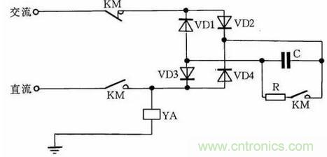 快速退磁的工作原理是:直流電磁鐵斷電后,交流電源通過橋式整流器和YA向電容C充電,隨著電容C兩端電壓的不斷升高,充電電流越來越小,而通過YA的電流又是交變的,從而使電磁鐵快速退磁。電容C的容量要根據(jù)電磁鐵的實際情況現(xiàn)場試驗決定。R為放電電阻。
