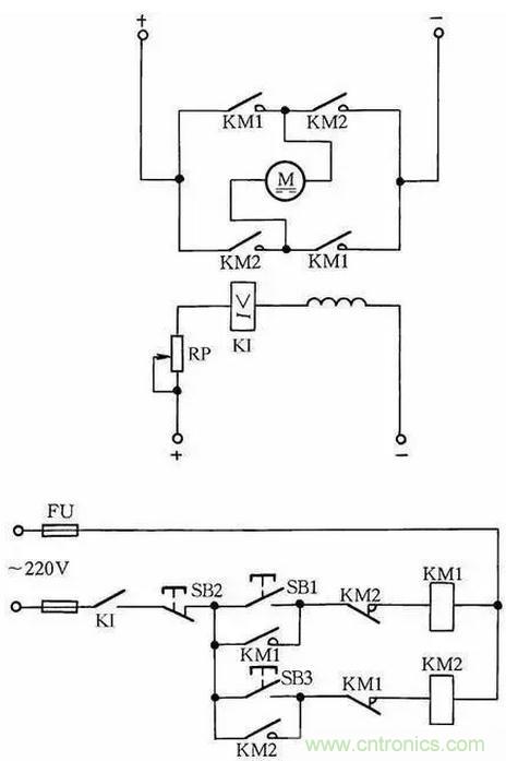 在勵磁電路內(nèi),串聯(lián)一個欠電流繼電器KI,其常開觸點接在控制電路中。當(dāng)勵磁電流消失或減小到設(shè)定值時,KI釋放,KI常開觸點斷開,切斷電動機電樞電源,使電動機停轉(zhuǎn),從而避免超速現(xiàn)象發(fā)生,見圖11。